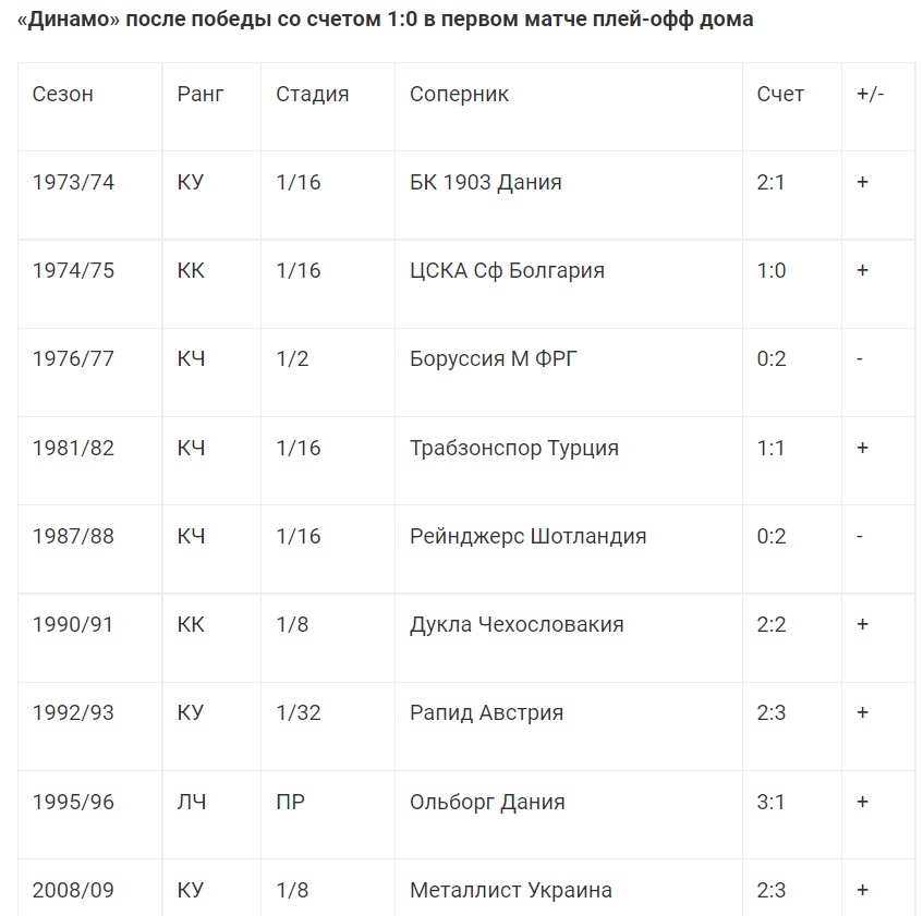 "Динамо" в 7 случаях из 9 проходило дальше, выиграв в плей-офф дома 1:0