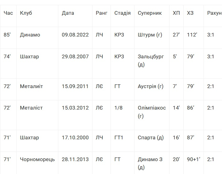 Найповільніші відіграші українських клубів у єврокубках