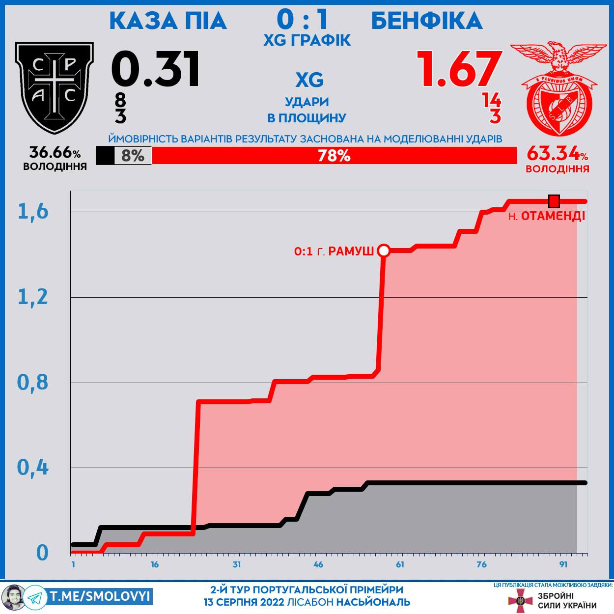 Після перерви Бенфіка таки заштовхала єдиний гол, але знову: момент фактично єдиний вартий уваги (єдиний за матч удар в площину з меж штрафного), після чергового спалаху геніальності Рафи Сілви Рамуш все ж забив свій гол (0.56 xG)