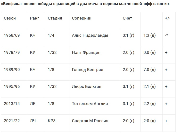 В свою очередь «Бенфика» 6 раз добивалась преимущества в два мяча в гостях, и лишь в одном случае этой форы не хватило португальцам для выхода в следующий круг.