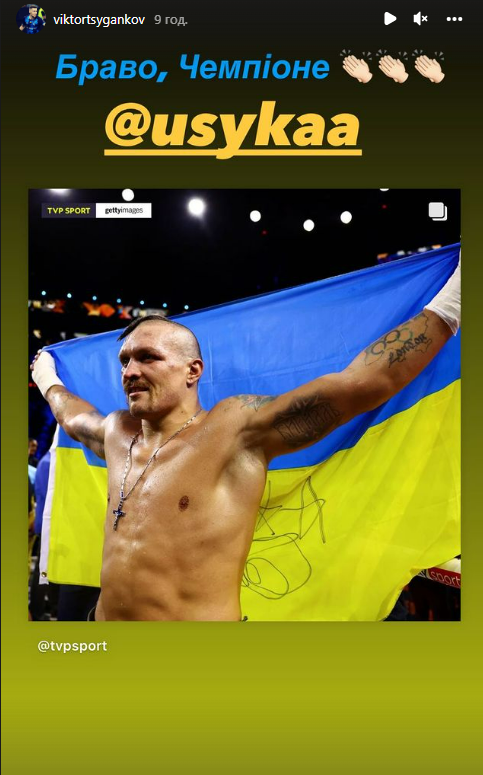 Полузащитник «Динамо» Виктор Цыганков в своем Инстаграме поздравил украинского боксера Александра Усика с победой над Энтони Джошуа.
