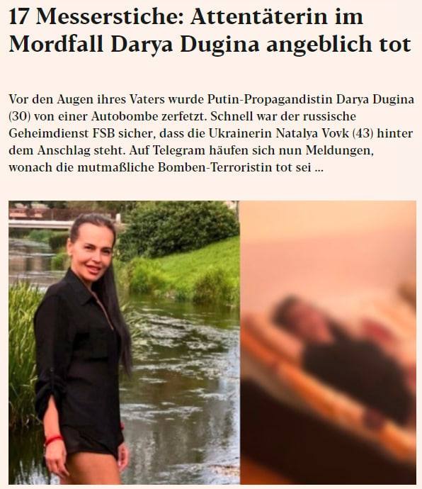 Наталью Вовк, которую обвиняли в убийстве Дарьи Дугиной, предположительно нашли мертвой с 17 ножевыми ранениями. У неё в руке была записка, сообщает австрийское издание Exxpress.