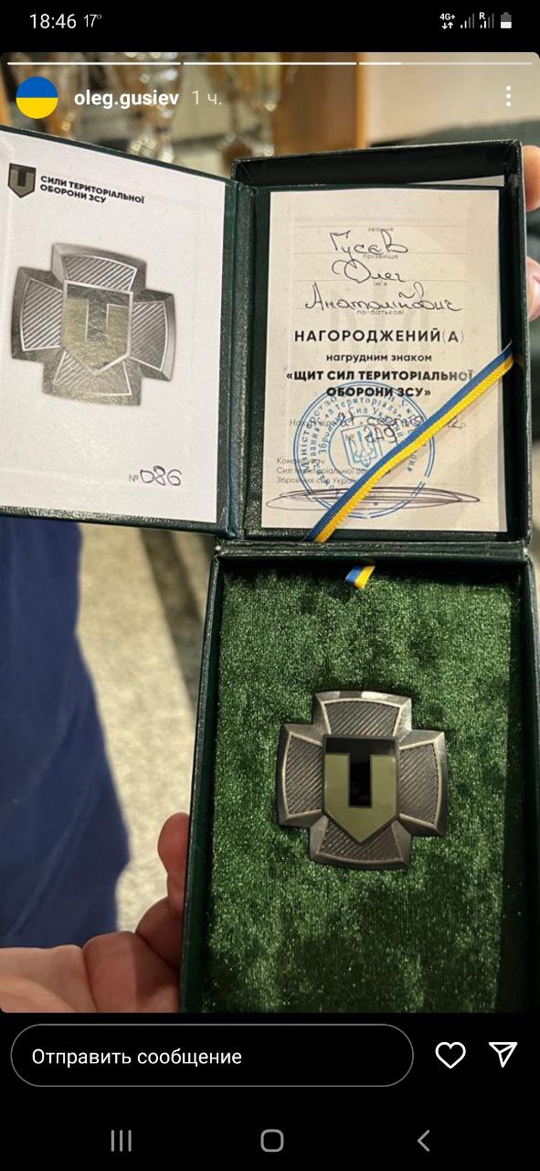 Олег Гусев получил награду "Щит территориальной обороны ВСУ"