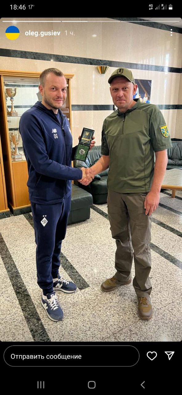 Ассистент главного тренера "Динамо" Олег Гусев получил награду "Щит территориальной обороны ВСУ", о чем сообщил в своем Instagram.
