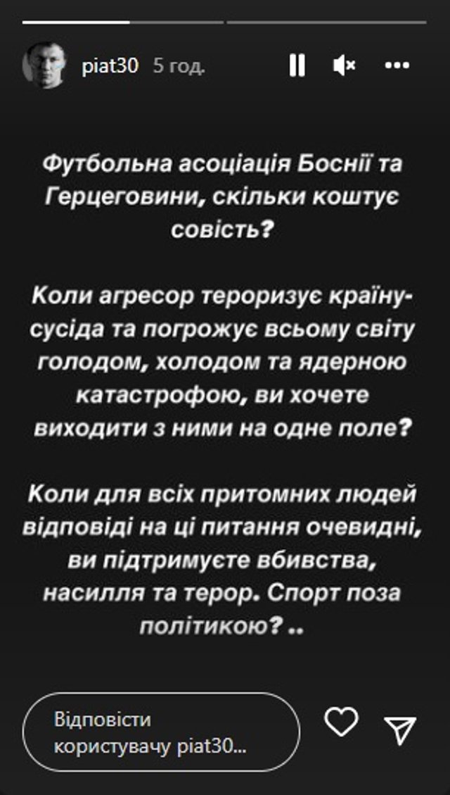 После этого Андрей обратился к Боснийской ассоциацией футбола: "Футбольная ассоциация Боснии и Герцеговины, сколько стоит совесть? Когда агрессор терроризирует страну-соседа и угрожает всему миру голодом, холодом и ядерной катастрофой, вы хотите выходить с ними на одно поле?