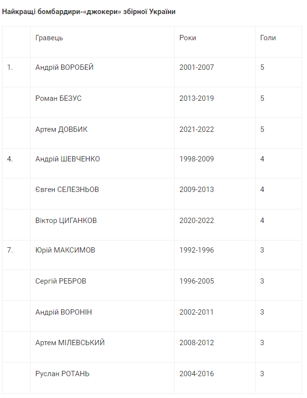 В матче с Арменией (5:0) Артем Довбык, сделав дубль, довел счет своих голов за сборную Украины до шести. Причем пять взятий ворот соперников он осуществил после выхода на замену, повторив тем самым рекордный результат Андрея Воробья и Романа Безуса.