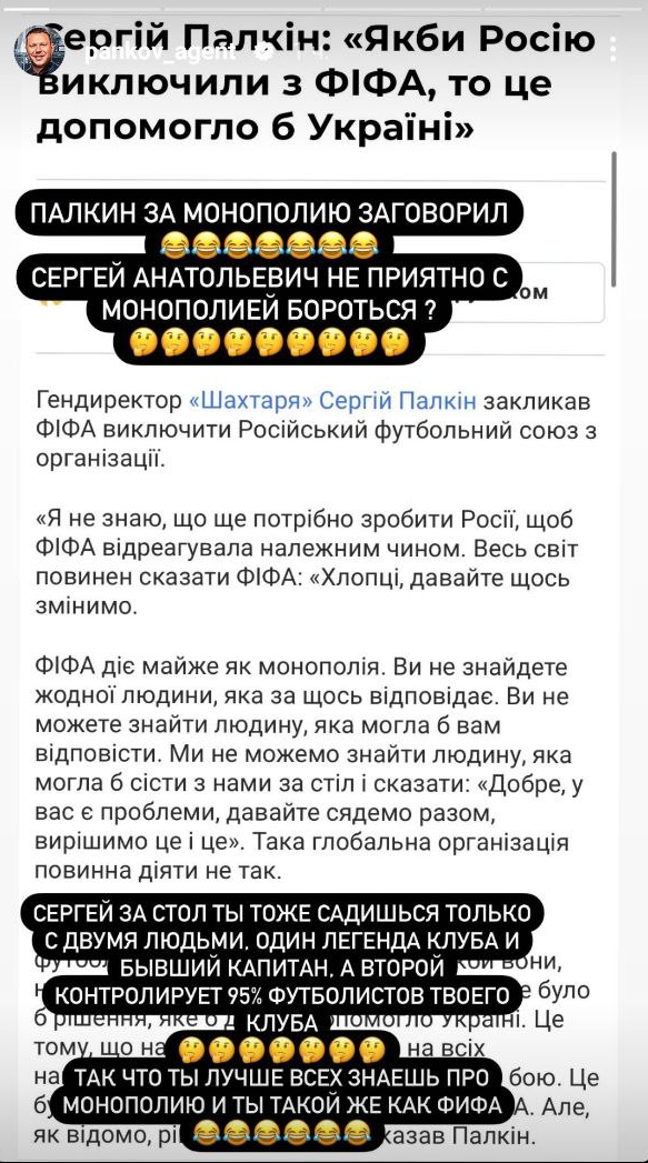 Известный агент Александр Панков в своем Instagram отреагировал на слова генерального директора "Шахтера" Сергея Палкина, который сказал, что ФИФА действует "почти как монополия".