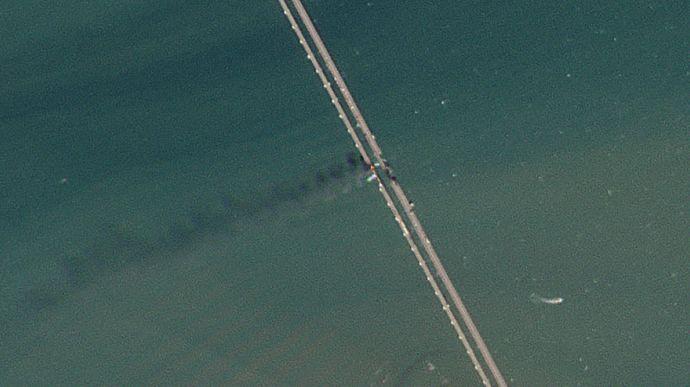 Опубликованы спутниковые снимки, на которых видны повреждения на Крымском мосту после взрыва в субботу.