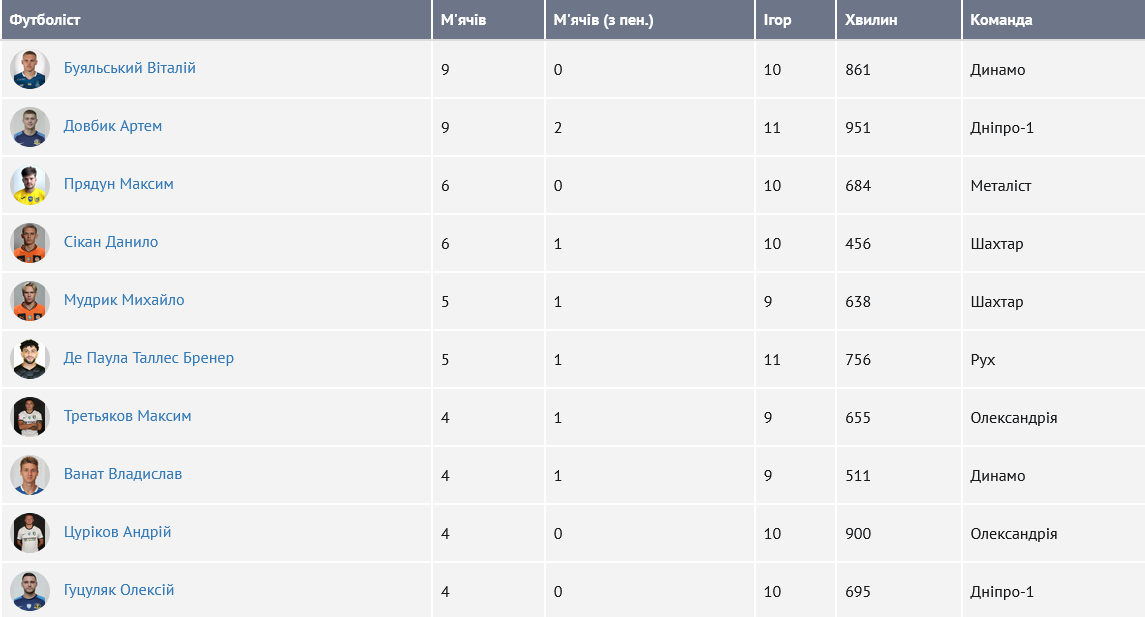 У Довбыка и Буяльского сейчас по 9 мячей, однако Лига котирует Виталия выше, потому что он сыграл на один матч меньше.