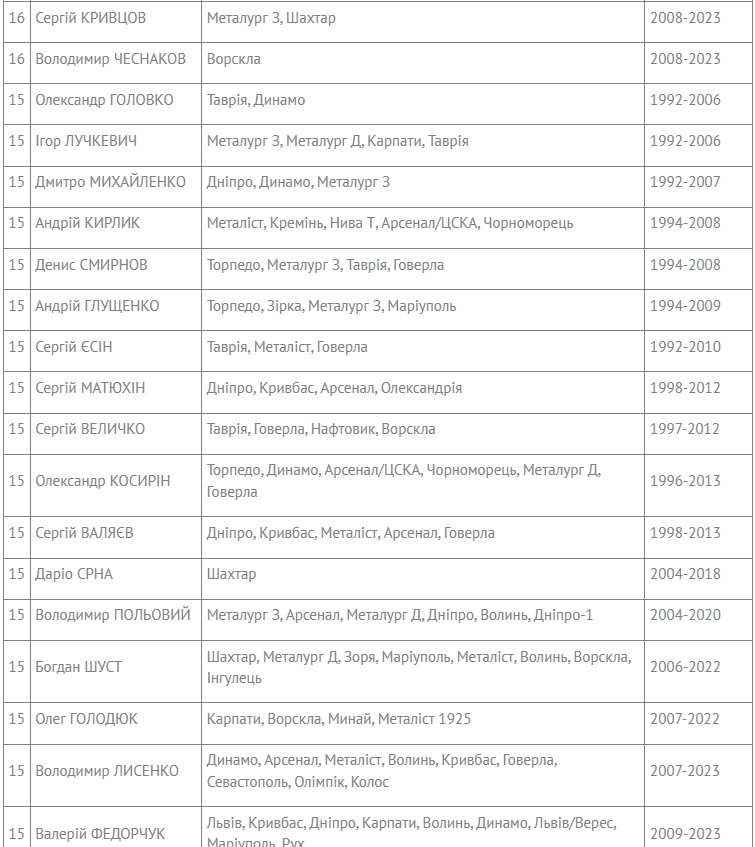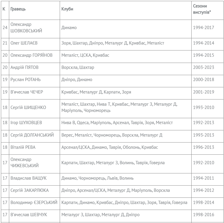 Вместе с тем вызывает интерес и список старожилов украинских Чемпионатов. И возглавляет этот рейтинг многолетний вратарь «Динамо» Александр Шовковский, принимавший участие в 24 (!) сезонах. Среди игроков, выступавших в нынешнем Чемпионате-2022/2023, выделим начавшего уже 20-й сезон Андрея Пятова («Шахтер») и вместе с другим вратарем Александром Горяиновым по этому показателю разделяет 3-4 места.