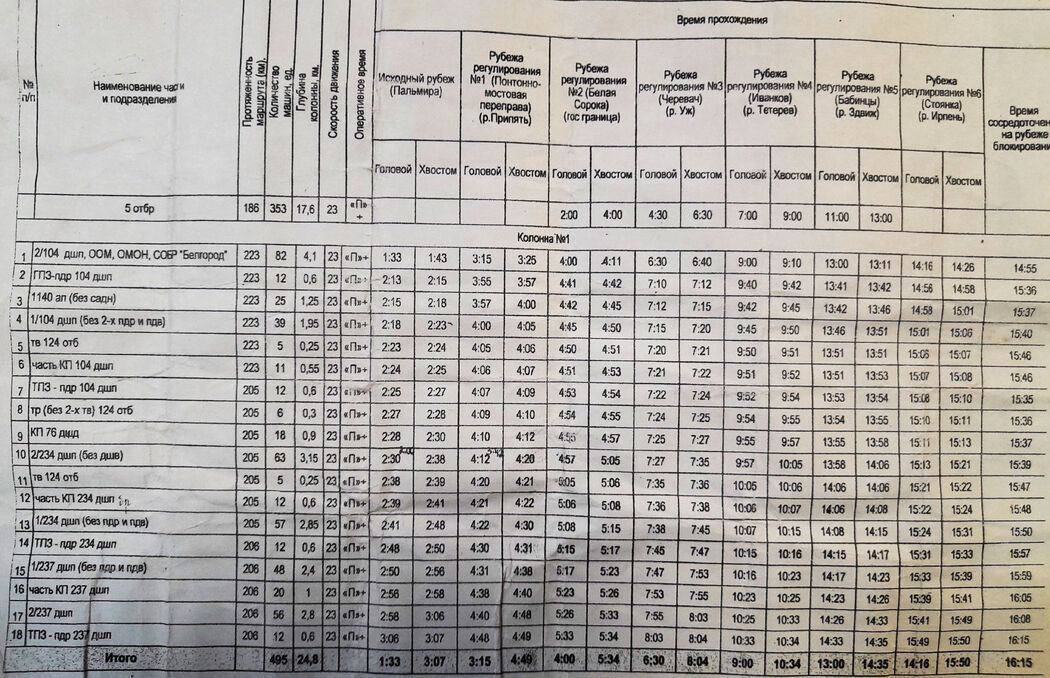 Согласно расписанию и бортовому журналу части, которые получило издание, первые машины в его колонне должны были выйти из Беларуси и прибыть на окраины Киева в 14:55, даже быстрее, чем сказали солдату.