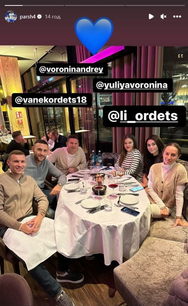 Россиянин Сергей Паршивлюк в Instagram опубликовал кадры совместного ужина с Ордецем, Ворониным и их семьями. Андрей же сделал репост сторис. Тройка вместе работала в московском Динамо.