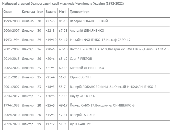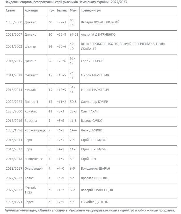 Зафиксированное это событие только в 15 туре и стартовая беспроигрышная серия подопечных Александра Кучера стала новым клубным рекордом в Чемпионатах Украины. Кроме «Днепра-1», в нынешнем сезоне подняли планку стартовых беспроигрышных клубных серий в Чемпионатах также «Колос» и «Металлист 1925». За всю же историю 32-х Чемпионатов Украины лишь четырежды клубу удавалось пройти весь сезон без какого-либо (!) поражения. Соавторами этого рекорда являются «Динамо» – в сезонах 1999/2000, 2006/2007, 2014/2015 и «Шахтер» – 2001/2002.