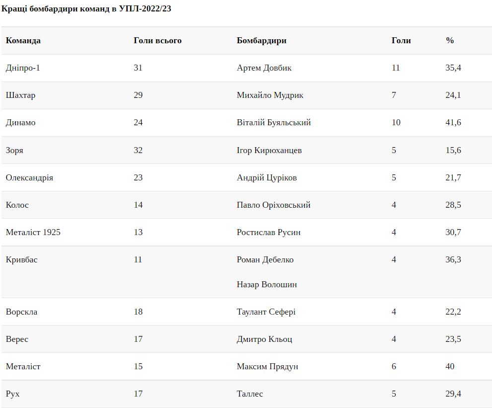 Если брать в процентах от командных голов, то самый высокий показатель у Буяльского. Хавбек оформил 10 из 24 голов Динамо в первой половине УПЛ. Треть или больше мячей на счету Максима Прядуна из Металлиста, Довбыка, криворожцев Романа Дебелко и Назара Волошина, Владислава Бугая из Львова.