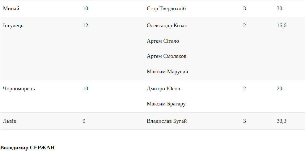 Только у двух команд есть несколько футболистов, делящих пальму первенства. Это Ингулец с четырьмя лучшими снайперами и Черноморец с двумя.