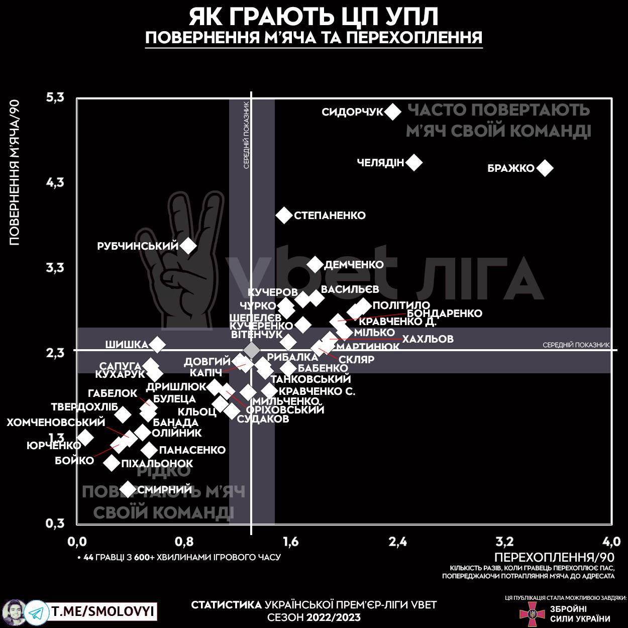 До елітних «перехоплювачів», що мають більшу за середнього ЦП їх кількість малюємо Політила з Чорноморця та Дмитра Кравченка з Металіста 1925. Поруч Мілько з Колосу та Бондаренко з Шахтаря.