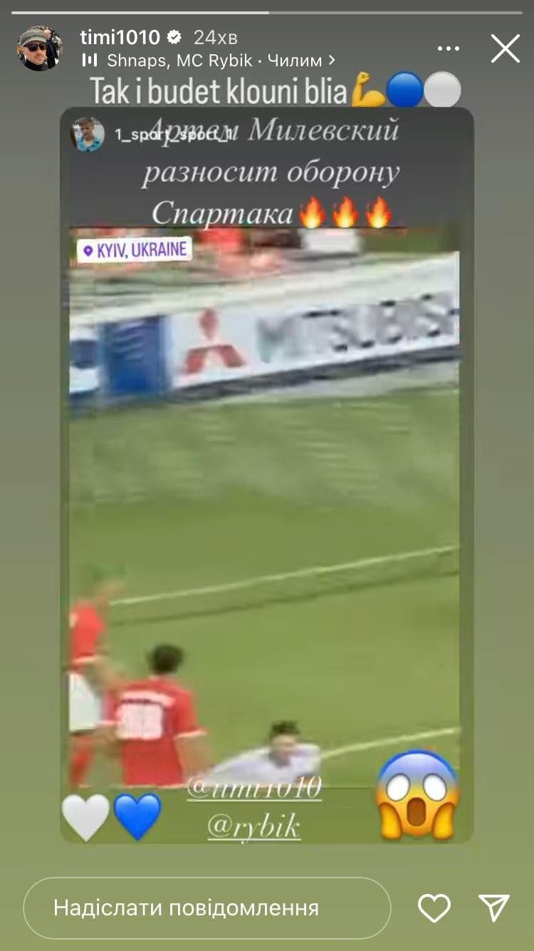 "Так и будет, клоуны, бл*", – написал Артем в первом сторис. Правда, вскоре он его удалил и смягчил обращение: "Клоуны. Киев – сила".