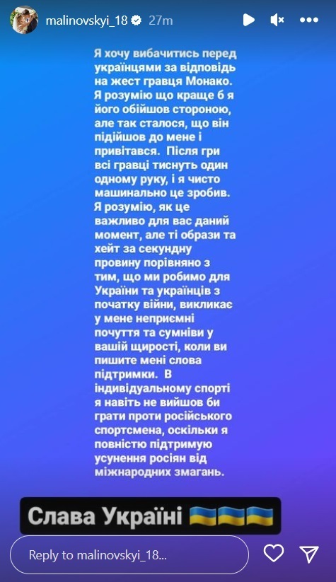 «Я хочу извиниться перед украинцами за ответ на жест игрока «Монако». Я понимаю, что лучше бы я его обошел стороной, но так случилось, что он подошел ко мне и поздоровался. После игры все игроки пожимают друг другу руку, и я чисто машинально это сделал.
