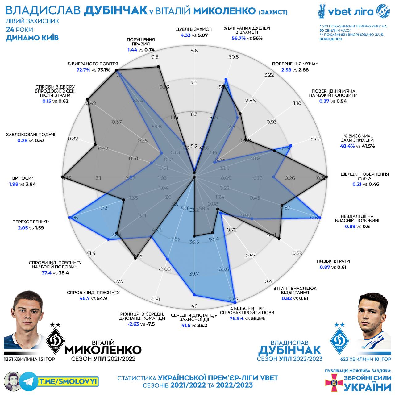 Блогер Михайло Смоловий у своєму Телеграм-каналі порівнює гру Владислава Дубінчака та Віталія Миколенка.