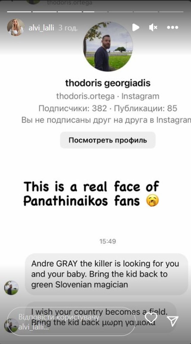 Девушка в своем Instagram показала сообщение от одного из фанатов. "Киллер Андре Грей ищет тебя с твоим малышом. Верни ребенка словенскому волшебнику в зеленом (цвета Панатинаикоса, за который выступает Вербич – прим.). Желаю, чтобы твоя страна превратилась в поле, верни ребенка обратно".
