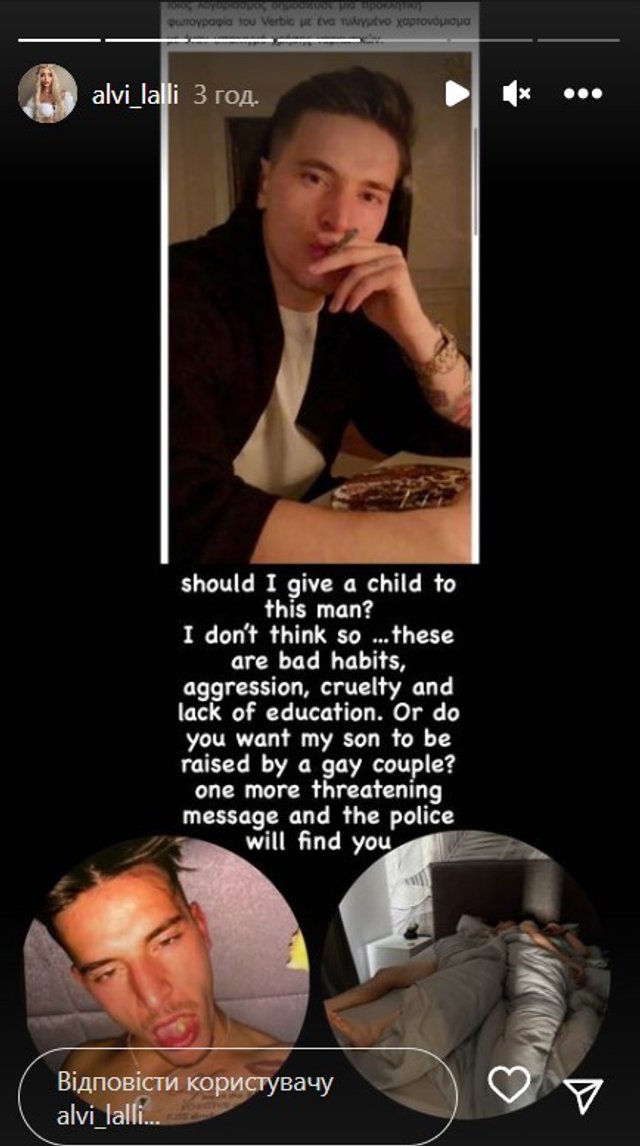 В ответ Альвина выложила некоторые фотографии Вербича с гулянок, в частности на которых он сидит с сигаретой. "Должна ли я отдать ребенка этому мужчине? Не думаю так... Его вредные привычки, агрессия, жестокость и недостаток образования. Или ты хочешь, чтобы моего сына воспитывала гей-пара? Еще одно сообщение с угрозами, и полиция тебя найдет.