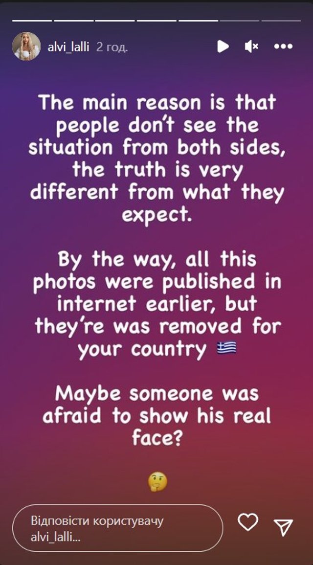 Главная причина – то, что люди не видят ситуацию с обеих сторон. Правда отличается от того, что они ожидают услышать. Кстати, эти фотографии были выложены в интернет раньше, но почему-то забанены для твоей страны (Греции). Возможно кто-то боится показать свое истинное лицо?" – написала девушка в своем Instagram.