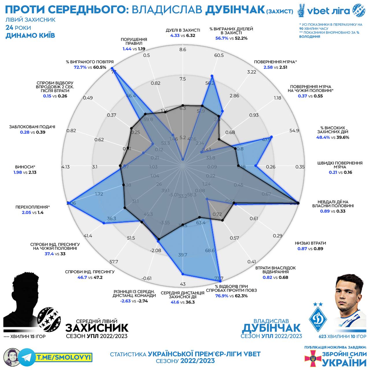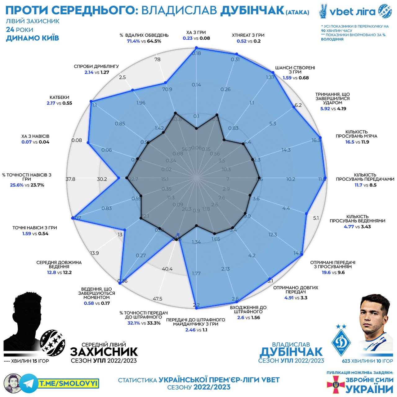 Тут власне і відповідь, чому на деякі хиби Дубінчака в захисті можна закривати очі на довгій дистанції. Він суттєво переважає середнього ЛЗ УПЛ майже за усіма атакувальними метриками. Враховуючи, що Динамо більшість часу проводить в атаці, а не в захисті, то на дистанції 30 турів - його внесок в атаку здатен перекрити його ж власні помилки в захисті. Поступається Владислав 1.2% лише в точності передач до штрафного. Але про це вже писав багато разів: за наявності нормального лівого вінгера та якісної взаємодії з ЛЦП, показник зросте до більш пристойного рівня. Над цим сподіваюсь працюватимуть у другій частині зимової підготовки, бо досі й не починали.
