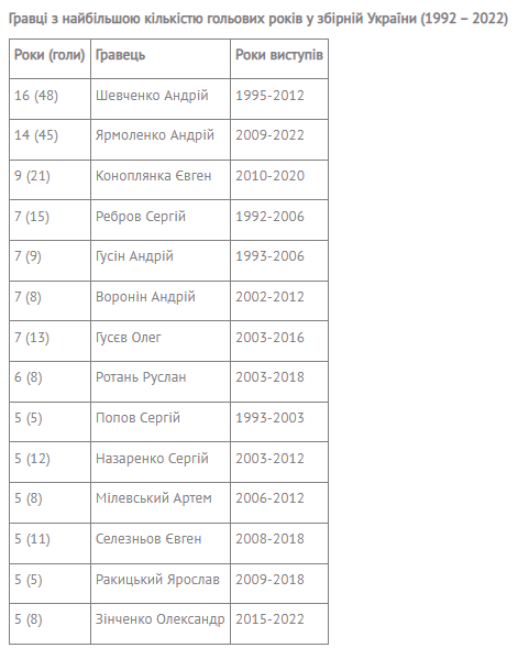 Игроки с наибольшим количеством голевых лет в сборной Украины: Ярмоленко догоняет Шевченко