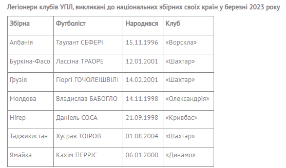 Вызовы в национальные сборные своих стран на мартовские матчи получили легионеры пяти клубов УПЛ — «Ворсклы», «Динамо», «Кривбасса», «Александрии» и «Шахтера».