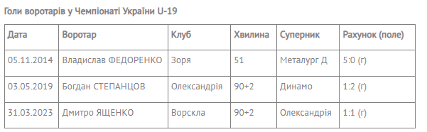 Стоит отметить, что голы вратарей попадались и в Чемпионате Украины U-21 (Максим Старцев в декабре 2009-го с пенальти, Антон Яшков в июле 2011-го с пенальти и Юрий Гаврусевич в апреле 2017-го по игре), и в элитном диве .