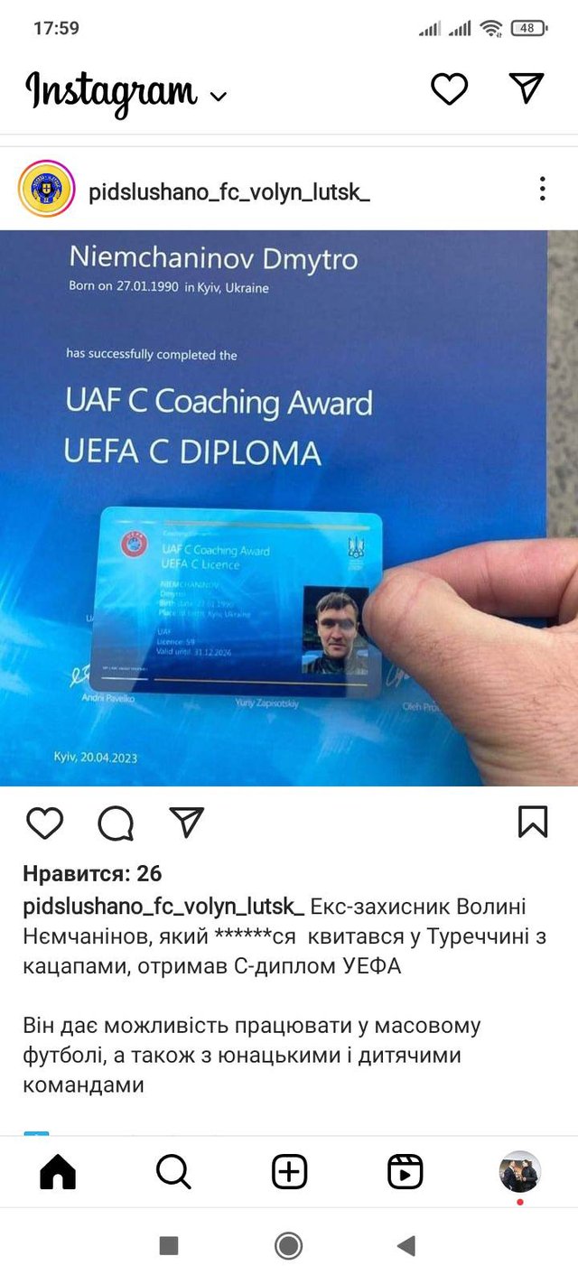 Паблик "Подслушано Волынь Луцк" в Instagram опубликовал фотографию с тренерским дипломом категории C, который получил Дмитрий Немчанинов.