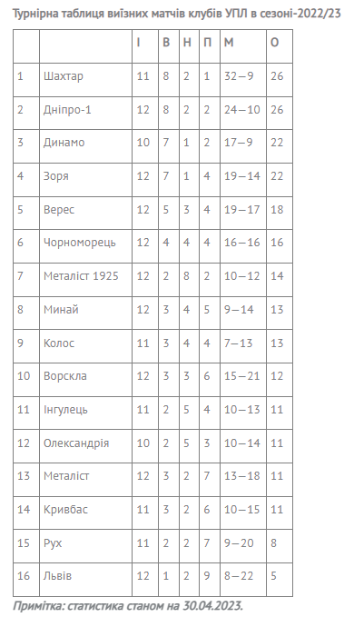 Вслед за турнирной таблицей домашних матчей клубов УПЛ в сезоне-2022/23 предлагаем посмотреть на аналогичный рейтинг на базе выездных матчей.
