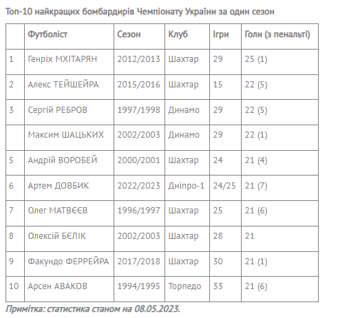 В любом случае, имея 21 гол в этом ЧУ, Довбык уже вошел в топ-10 лучших бомбардиров за сезон. Столько же забивали еще пять игроков (первым до такой отметки добрался Арсен Аваков из запорожского «Торпедо» в сезоне-1994/95), больше только четверо (первым — динамовец Сергей Ребров в сезоне-1997/98).