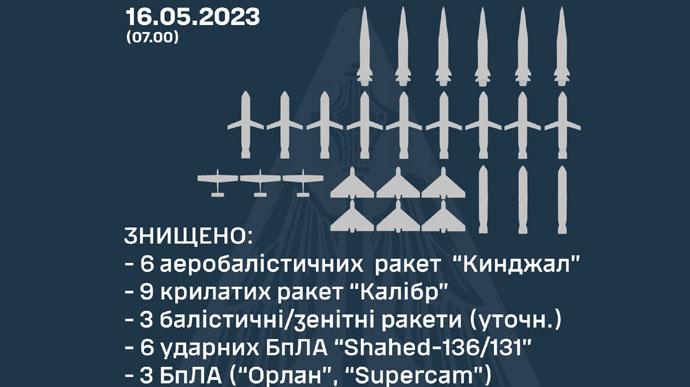 Российские захватчики ночью 16 мая атаковали Украину 18 ракетами различных типов и беспилотниками "Шахед" − все вражеские цели защитники сбили.