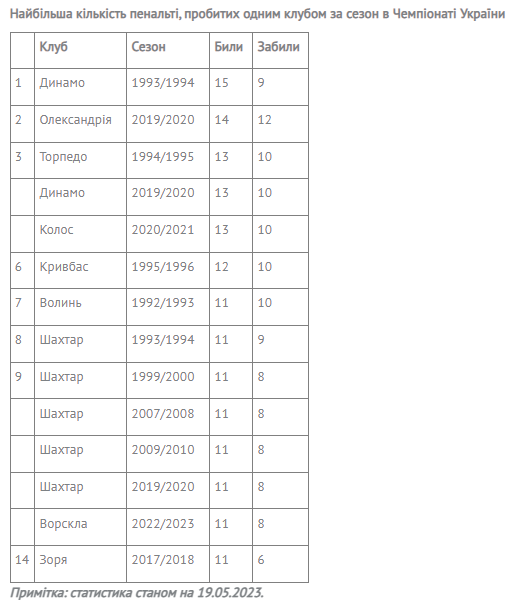 Рекорд почти 30 лет удерживает «Динамо» - 15 пенальти в сезоне-1993/94. Максимально близко к нему подбиралась «Александрия» (14 ударов в сезоне-2019/20).