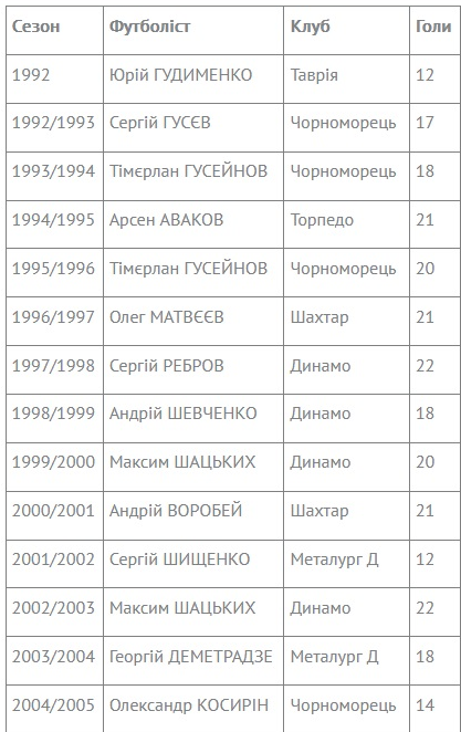 Найкращі бомбардири Чемпіонату України по сезонах (1992—2023)