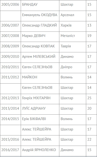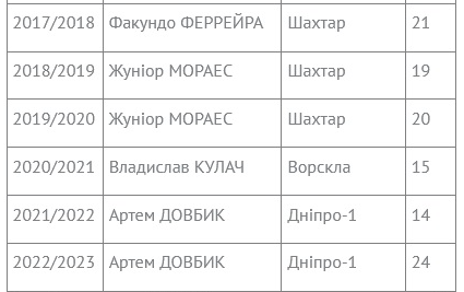 Примітка: сезон-2021/22 через москальську навалу було завершено після 18-ти турів, призерів та лауреатів не визначали.
