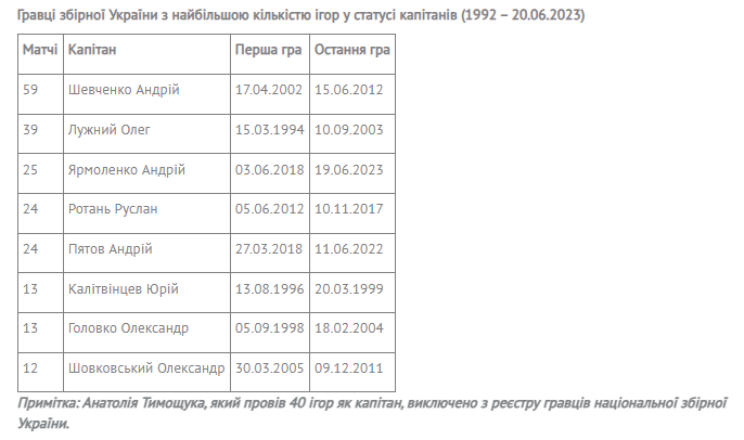 Андрей Ярмоленко провел свой юбилейный, 25-й, матч в статусе капитана, опередив по этому показателю Руслана Ротаня и Андрея Пятова.