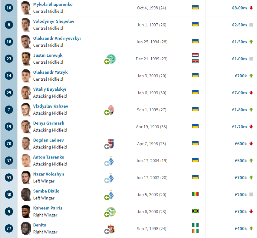 В то же время подорожали 12 игроков: Руслан Нещерет, Максим Дячук, Антон Боль, Константин Вивчаренко, Александр Тымчик, Александр Андриевский, Александр Яцык, Владислав Кабаев, Антон Царенко, Назар Волошин, Бенито и Владислав Ванат.