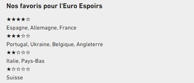 L'Equipe ранжировал фаворитов Евро-2023: Испания, Германия и Франция получили по четыре звезды из пяти, Португалия, Украина, Бельгия и Англия – по три звезды, Италия и Нидерланды – по две. Главным аутсайдером турнира французская редакция считает Швейцарию.