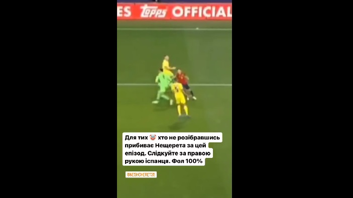 Журналист Виктор Вацко выложил увеличенное видео эпизода и написал в соцсетях: «Не ругайте Нещерета. Следите за правой рукой испанца. Фол 100%».