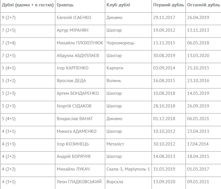 Гравці з найбільшою кількістю дублів у Чемпіонатах України U-19 (2012 – 24.07.2023)
