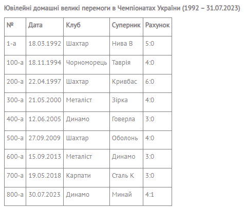 Начиная с 1992 года года в Чемпионатах большие домашние победы праздновали 40 клубов, а больше всего разгромных викторий на своем поле у «Шахтера» – 148, «Динамо» – 135 и «Днепра» – 59.