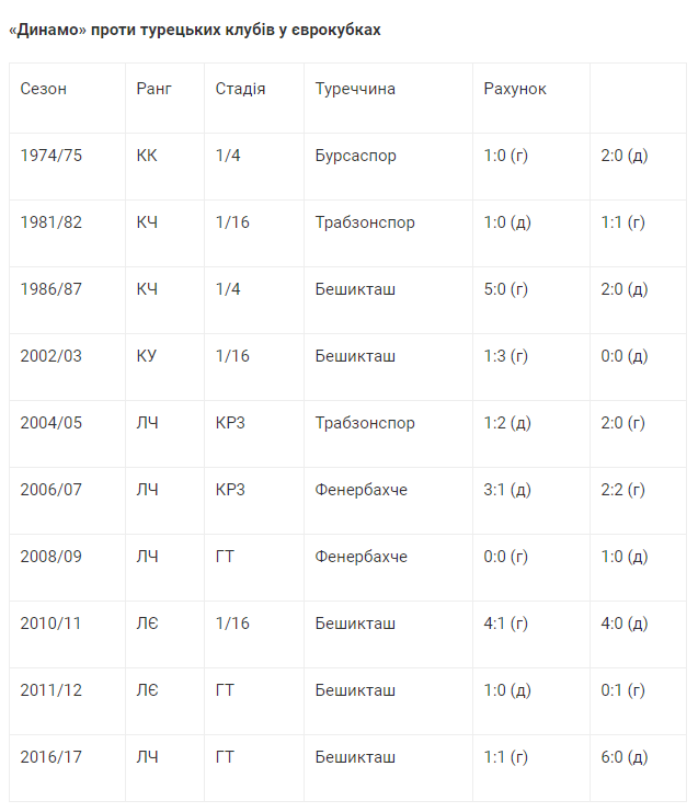 Ранее киевляне восемь раз встречались с командами из Турции на стадии плей-офф, и в семи случаях перевес был на стороне бело-синих. С «Бешикташем» динамовцы пересекались пять раз, в том числе дважды в «олимпийке». В 1/4 финала Кубка чемпионов-1986/87 верх по сумме двух матчей взяли бело-синие, а в 1/16-й Кубка УЕФА-2002/03 – черно-белые.