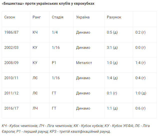 В свою очередь «Бешикташ» в 12 играх с украинскими командами довольствовался лишь тремя победами при двух ничьих и семи поражениях (мячи 8-28).