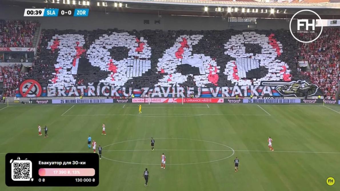 Ультрас чешской Славии, соперника луганской Зари в финальной квалификации за право играть в групповом этапе Лиги Европы 2023/2024 годов, показали на трибунах стадиона в Праге огромный баннер.