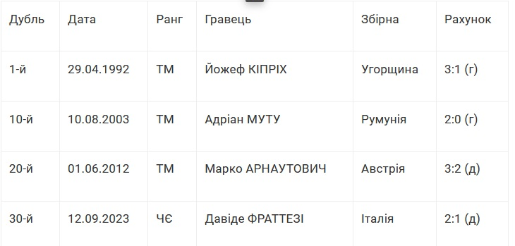Тим часом дубль Фраттезі виявився ювілейним – 30-м в історії для суперників українців. По два м'ячі за гру забивали нашій національній дружині футболісти 18 країн. Найчастіше італійці – 4 рази, іспанці, румуни та французи – по 3.