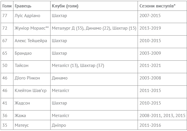 У Чемпіонатах України голи провождили вже 128 бразильських легіонерів, а очолює список найкращих голедорів Луіс Адріано з «Шахтаря», в активі якого 77 точних ударів.