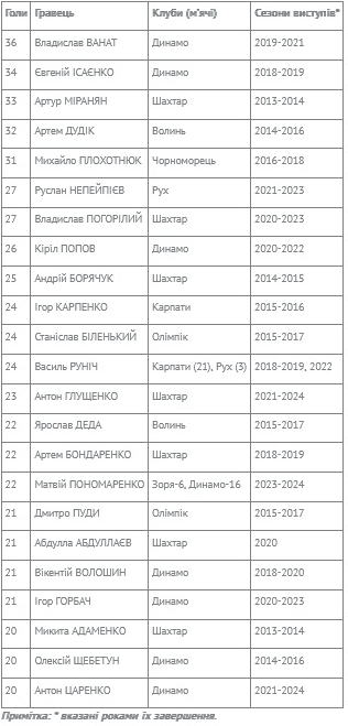 І лідерство у списку найкращих голеадорів-юнаків займає Владислав Ванат, який у складі «Динамо» забив 36 голів.