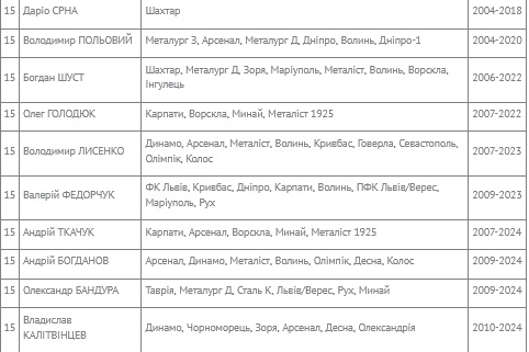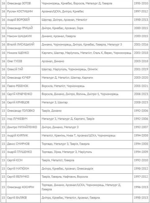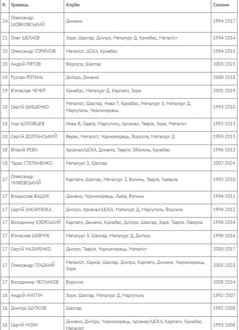 І очолює цей рейтинг багаторічний воротар «Динамо» Олександр Шовковський, який брав участь у 24-х (!) сезонах.